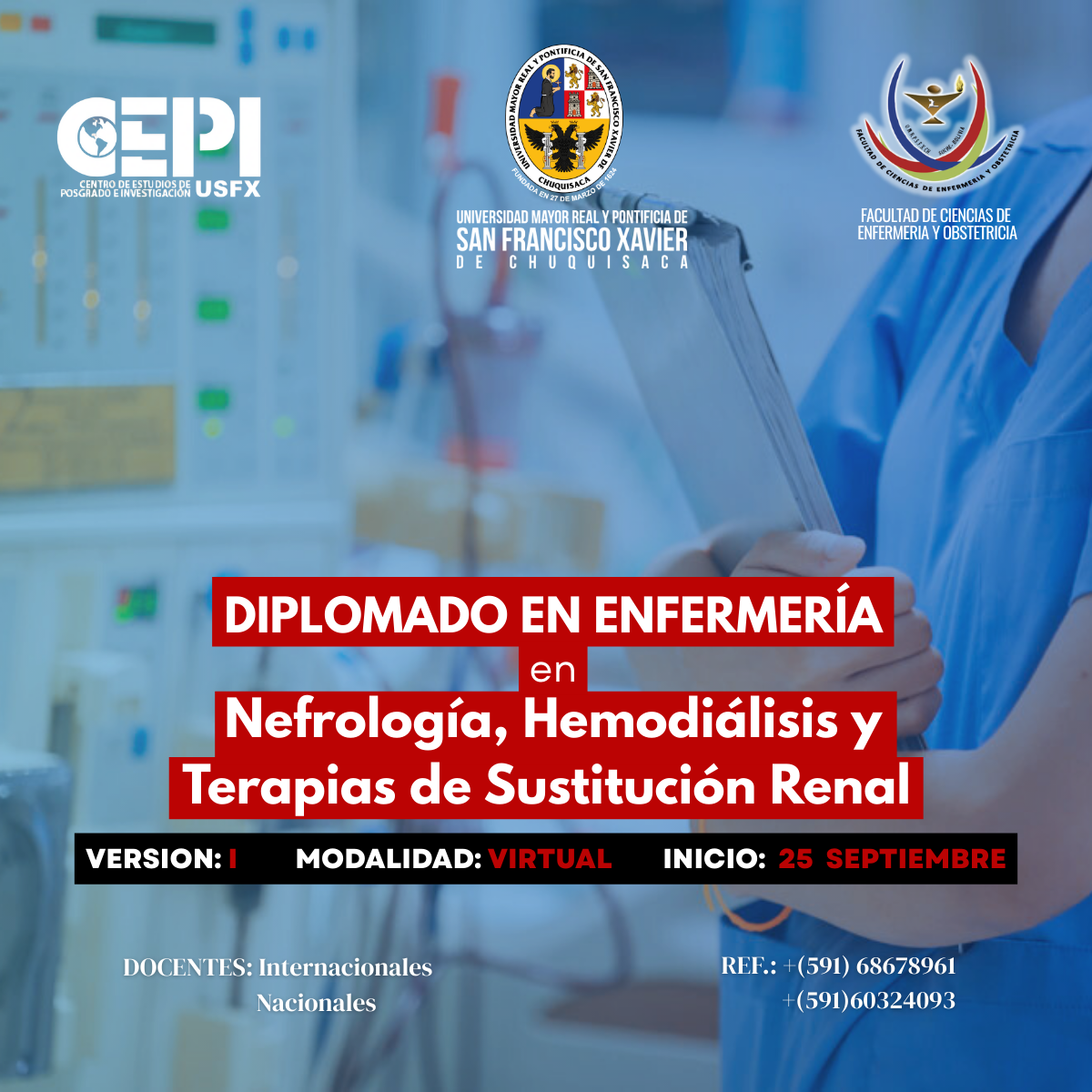 El Diplomado de Enfermería en Nefrología, Hemodiálisis y Terapias de Sustitución Renal, organizado por la prestigiosa Universidad San Francisco Xavier de Chuquisaca, en coordinación con el CEPI y la Facultad de Ciencias de Enfermería y Obstetricia, está diseñado para brindar una formación académica de alto nivel en un área crítica de la salud. Este programa representa una oportunidad única para que los profesionales fortalezcan sus competencias y respondan a las crecientes demandas en el cuidado del paciente con enfermedad renal.
